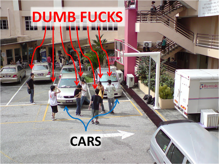 Those people are the DUMBEST fucks I've ever seen. Period. I once parked my car a good 15 (Yes, FIFTEEN, take note of the number) metres away from that area. And when I was IN the car, I heard the fucked up sound of a ball bouncing off my car. My car was FIFTEEN metres away, and yet the ball hit my car. Now look how close those cars are in the picture. Happy repairing your cars J